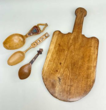 FOUR ITEMS OF TREEN comprising an oat-cake slice or riddleboard, 43cms, a sycamore wood treen lovespoon with pierced handle, 20.5cms, a lovespoon with double heart handle with glass locket insert, inscribed 'PED', 21cms, and a Zulu carved spoon with crowned finial, 14cms (4)Provenance:private collection Cardiff, consigned via our Cardiff officeCondition Report:riddleboard cracked handle, lovespoon cracked handle