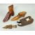 FOUR CARVED TREEN 'SHOES', comprising a bone inlay double clog snuff box, shoe snuff box with sliding lid, shoe pipe tamper, and model shoe (4)