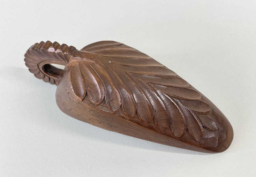 19TH CENTURY CARVED PAP BOAT, probably French Cherry wood, decorated with leaf motifs, and shallow punched guilloche bandsDimensions: 13cms longProvenance:'The St John Perrott Stimson Collection of Treen & British Folk Art’ Please see This Autumn: Treen & British Folk Art — Rogers Jones Co (EN)Condition Report:small cracks to tip and handle