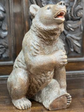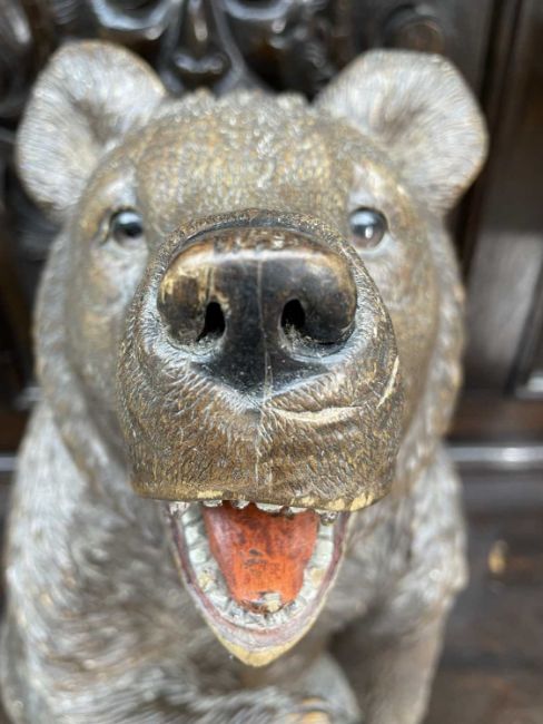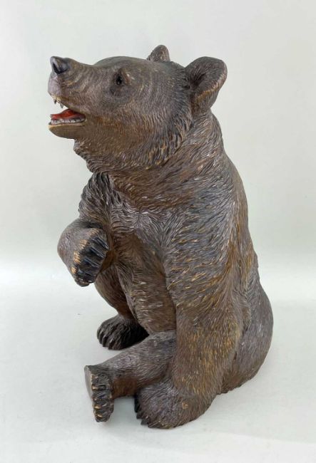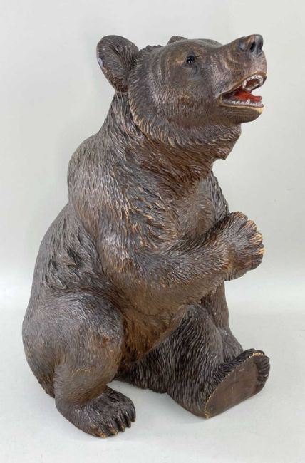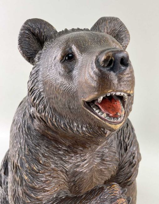 SWISS 'BLACK FOREST' LINDENWOOD BEAR, seated with open mouth revealing painted details, painted nose, glass inset eyes, and well defined fur detailing