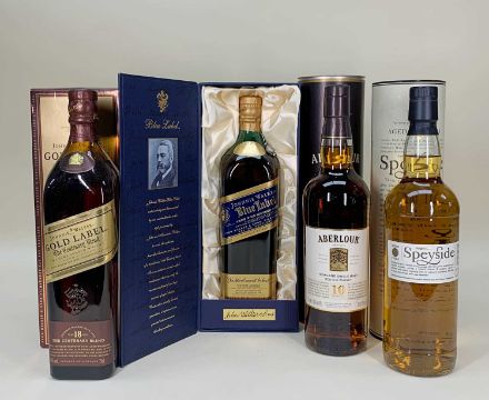 SELECTION OF SINGLE MALT & DELUXE BLENDED WHISKY comprising one 75cl bottle of Johnnie Walker 18yo The Centenary Blend 40%, one 75cl bottle of Johnnie Walker Blue Label #D598730 43%, one 70cl bottle of Aberlour 10yo Highland Single Malt Whisky 40% and one 70cl bottle of Waitrose 'own label' 12yo Speyside Single Malt Whisky 40% (4)Comments: each presented in their original presentation box/tube and all showing minor storage damage. All labels and foils are excellent