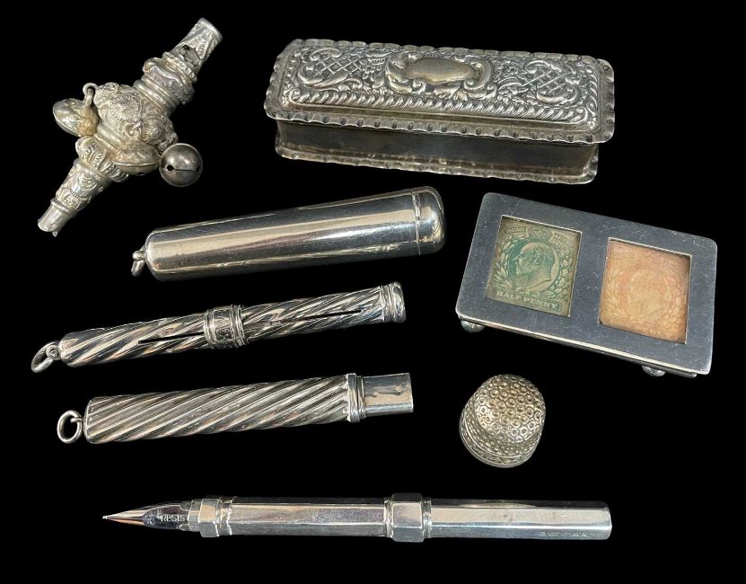 ASSORTED SILVER COLLECTIBLES, including late Victorian baby's rattle with whistle, late Victorian 9ct gold mounted amber cheroot holder in silver case, Edward VII stamp box, two pencil holders and a dip pen, thimble and embossed toothpick box, appr gross wt 5ozt (8)