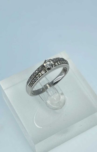 14K GOLD DIAMOND RING, the central stone measuring 0.2cts approx., set with a further 28 graduated diamonds to the shoulders, ring size N, 3.3gmsProvenance: private collection Caerphilly, consigned via our Cardiff OfficeComments: recently Rhodium plated