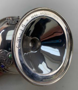 GEORGE V IRISH SILVER REPLICA OF THE ARDAGH CHALICE, maker RS, Dublin 1911, decorated with coloured enamel bosses and cabochons, Celtic motif banding, engraved inscription to base dated 1916, 9cms tall, on on a wooden plinthComments: three enamelled bosses and one cabochon missingNotes: The "Ardagh" chalice was found in 1868 by a yong man in Reerasta, close to the village of Ardagh in County Limerick. He happened upon it & other treasures whilst digging potatoes. Miraculously the chalice was undamaged and is the finest example of medieval Irish goldsmith's work. It dates from the 8/9th century and currently resides in the National Museum of Ireland, Dublin.