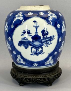 19TH CENTURY CHINESE BLUE & WHITE GINGER JAR - on a hardwood stand, 25cms tall