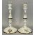 PAIR OF LATE 18TH CENTURY STAFFORDSHIRE ENAMEL CANDLESTICKS, painted in polychrome enamels with floral sprays on a white ground, having knopped columns and removeable star shaped nozzles, on domed hexafoil bases, 25cm high.