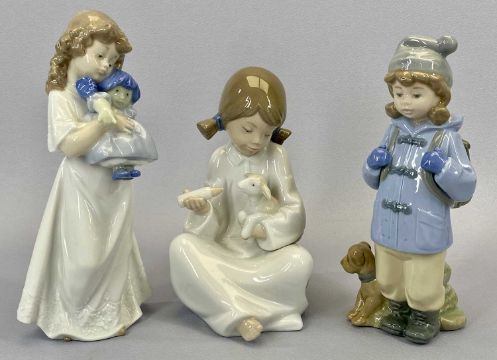ORNAMENTAL FIGURES (5 Nao figures), 31cms the tallest, Royal Doulton 'The Balloon Man' HN1954, 'The Old Balloon Seller' HN1315 and two items of Limoges