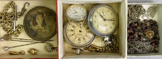VICTORIAN & LATER JEWELLERY, pocket watches and collectables group to include a small amber bead necklace, 44cms L, 12mm across the largest bead, 9.2grms, jet type floral brooch and necklaces, gilt metal horseshoe stick pin and others, diamante and other brooches and white metal necklaces ETC