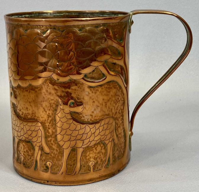 COPPERWARE - interesting embossed Newlyn type copper tankard, 14cms H and an assortment of other old copperware