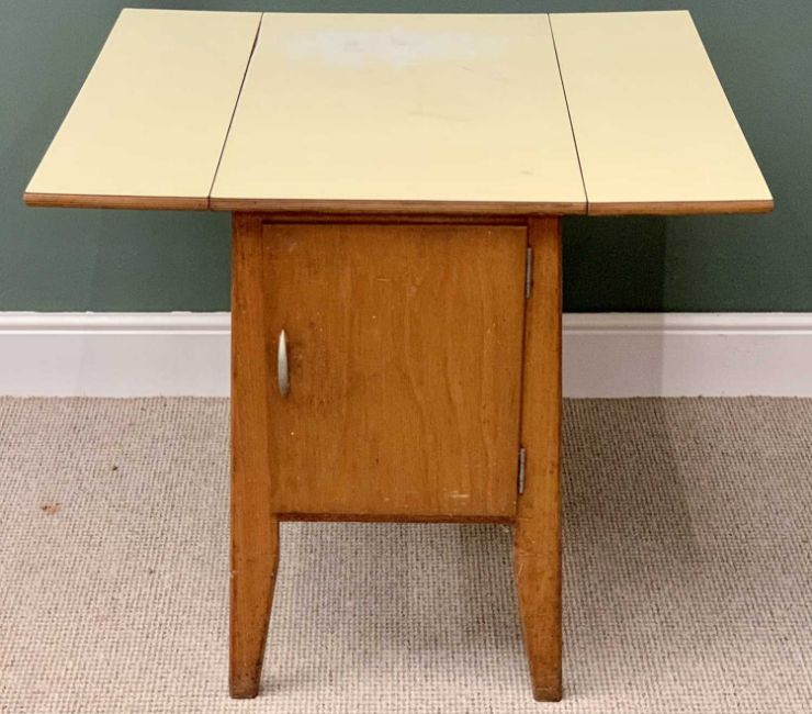 MID-CENTURY KITCHEN TABLE - with formica top, twin flaps and end drawers, 76cms H, 90cms open, 81cms D