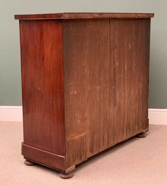 VICTORIAN MAHOGANY CHEST - two short over three long drawers with turned knobs, on bun feet, 115cms H, 122cms W, 52cms D