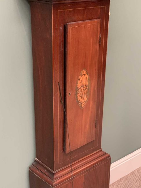 VICTORIAN MAHOGANY LONGCASE CLOCK - with brass arched dial, 'James Miller of Alloa' 8 day with weights and pendulum, 206cms H, 54cms W, 25cms D