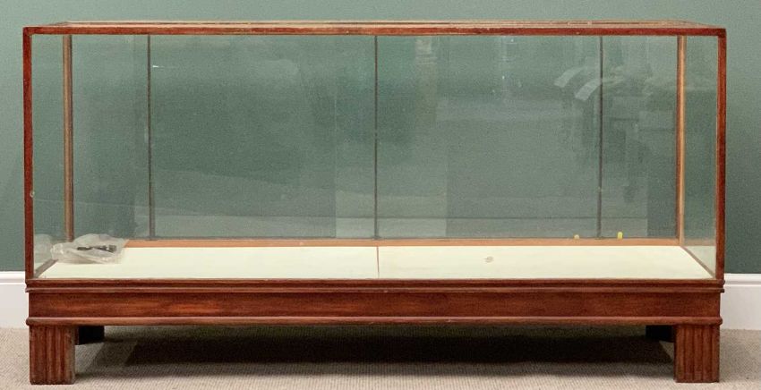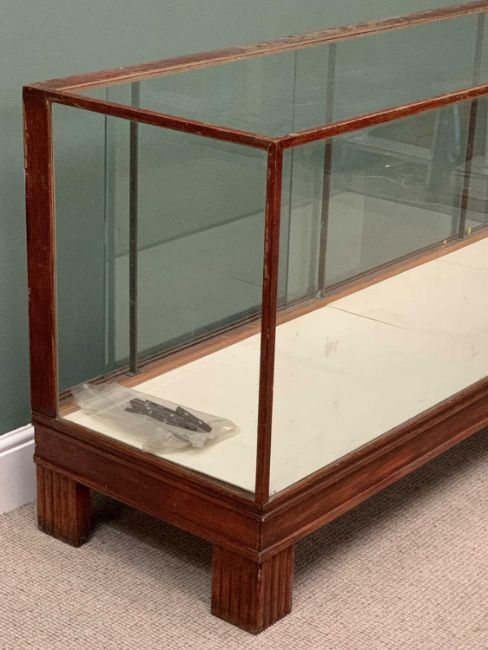 VINTAGE SHOP COUNTER CABINET with glazed top, front and ends, 92cms H, 179cms W, 59cms D
