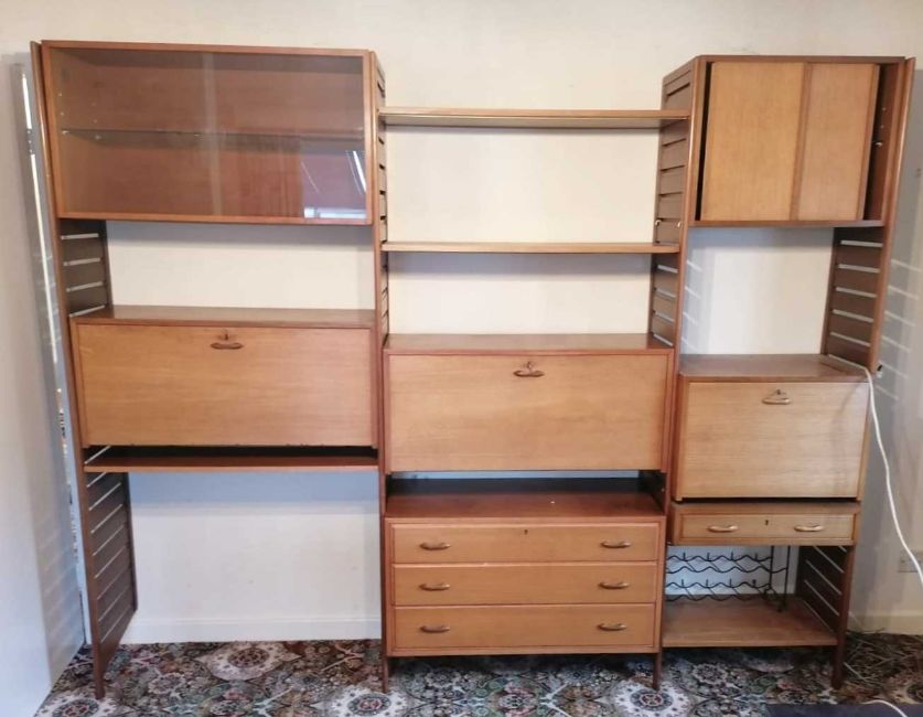 STAPLES `LADDERAX` TEAK MODULAR LOUNGE SYSTEM CIRCA 1970, comprising freestanding uprights, drawers, cabinets, cupboards, open shelves etc, 198cms H, 247cms approximate W, 38cms D