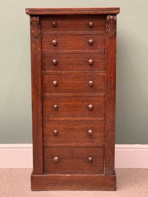 VINTAGE OAK WELLINGTON CHEST - 7 drawers with turned wooden knobs and carved detail to the uprights, 104cms H, 50cms W, 35cms D