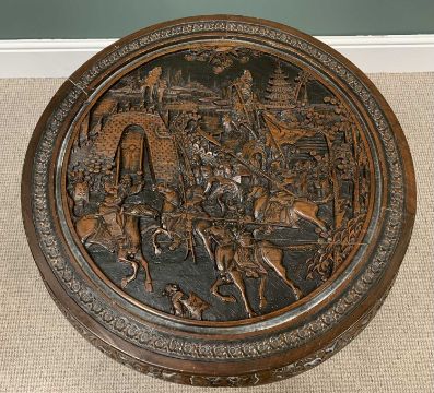 NEST OF 5 CARVED CHINESE HARDWOOD TABLES - one circular and four quarters, 50 x 76cms diameter