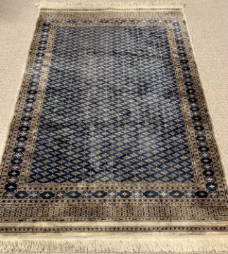 EASTERN TYPE WOOLLEN RUG - with tasselled ends, multiple border and gridded pattern diamond central section, 220 x 145cms