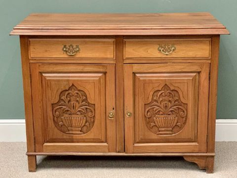 SATIN WALNUT SIDEBOARD - two drawers over two base cupboard doors and carved detail to the front, 95cms H, 126cms W, 50cms D