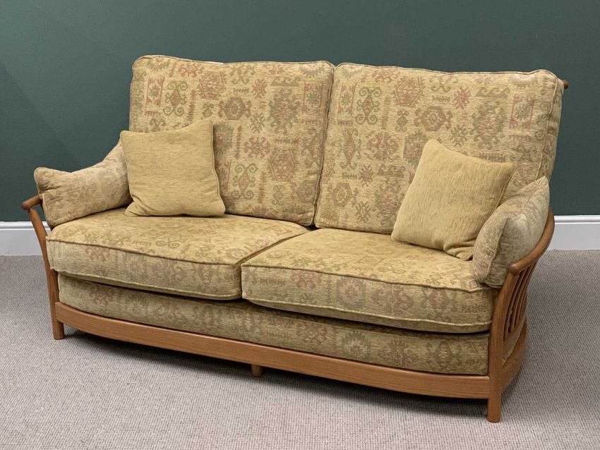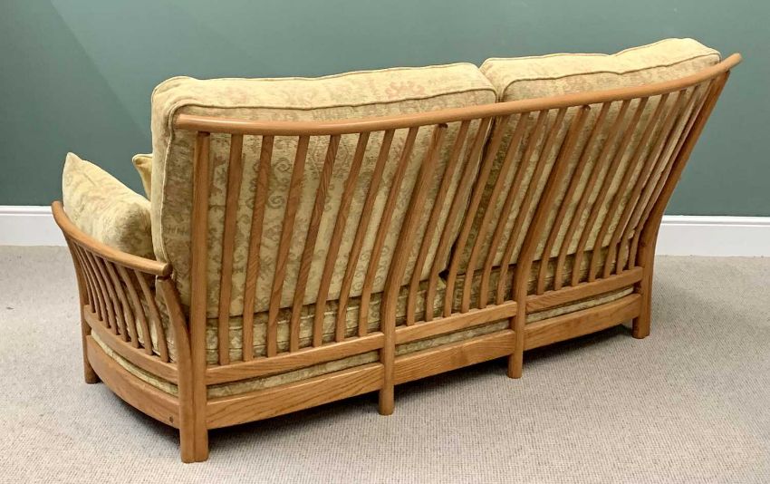 ERCOL LIGHT WOOD 3 PIECE LOUNGE SUITE - comprising sofa, 97cms H, 190cms W, 60cms D and a pair of armchairs, 97cms H, 90cms W, 60cms D