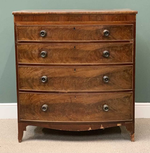 REGENCY CHEST OF 4 DRAWERS - bow fronted mahogany with turned knobs, 117cms H, 106cms W, 53cms D
