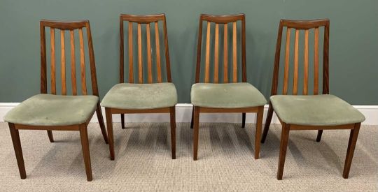 G-PLAN MID-CENTURY TEAK TYPE EXTENDING DINING TABLE & SET OF FOUR SLATBACK CHAIRS, 73cms H, 209cms W, 107cms (the table when open)