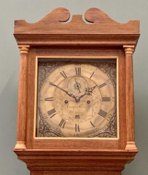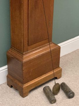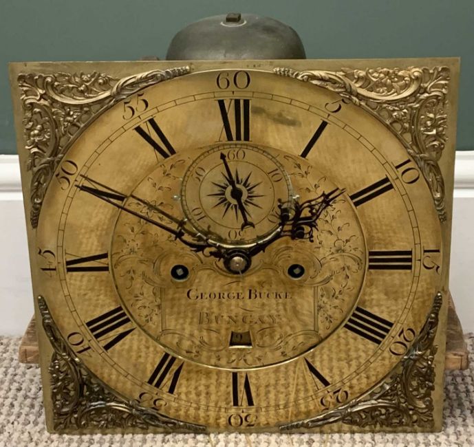 ANTIQUE OAK LONGCASE CLOCK by George Bucke, Bungay, 12ins square brass dial having pierced spandrels, the dial set with Roman numerals, subsidiary seconds dial and date aperture before a twin weight pendulum driven bell strike movement (pendulum and weights included), single glazed door hood with three quarter pillar decoration above a shaped top long trunk door and a stepped trunk base, 206cms H overall, 47.5cms W