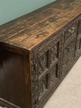 ANTIQUE SIDEBOARD - heavily carved oak with three central drawers flanked by two cupboard doors, 90cms H, 179cms W, 57cms D