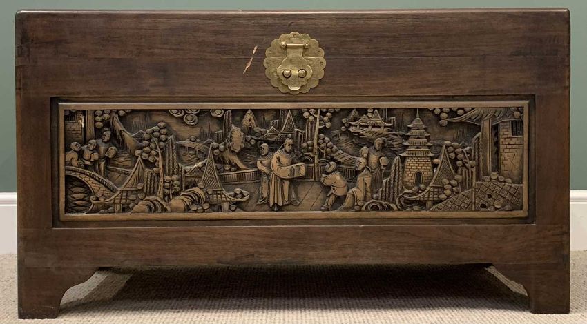 CHINESE CARVED CAMPHORWOOD CHEST, 58cms H, 103cms W, 52cms D