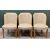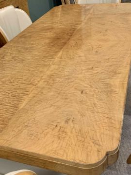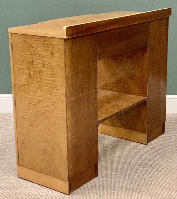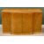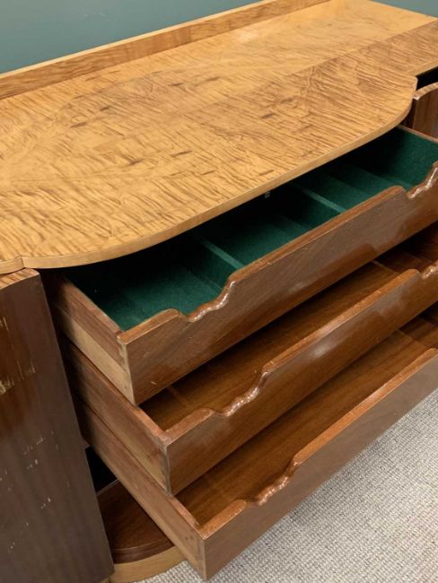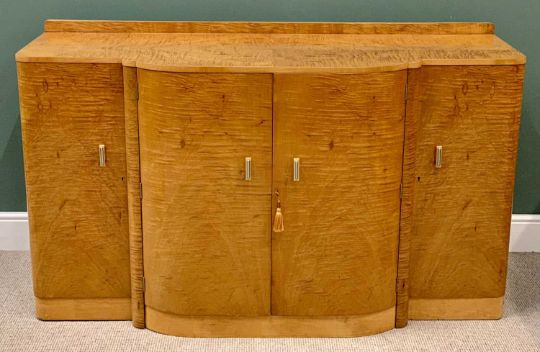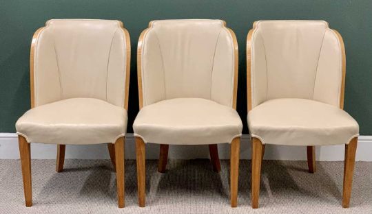 SUPERB ART DECO MAPLE VENEERED NINE PIECE DINING SUITE comprising dining table, quarter veneered having shaped corners on twin curved pedestal stands, 80cms H, 213.5cms L, 96.5cms W, six semi-cloud back open dining chairs in cream leather upholstery and full curved backs, on tapered front and swept back supports, 90cms H, 55cms W, 46.5cms D, four door railback sideboard having shaped breakfront and curved sides, the twin central doors opening to reveal three interior drawers and bottle storage holder, the outer doors both with interior shelving, 99cms H overall, 168cms W, 62cms D and a railback server with single central drawer and open lower shelf flanked by two curved end opening doors with interior shelves, 96.5cms H, 122cms W, 49.5cms D, the whole suite probably Epstein, original chrome and bakelite handles intact along with original chrome hinges