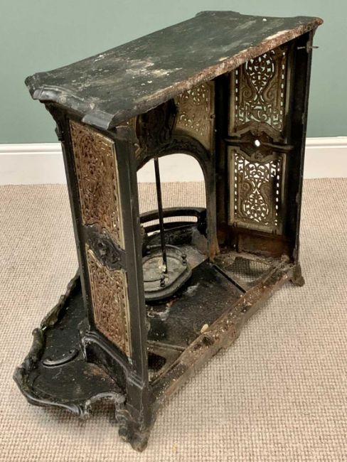 CIRCA 1900 CAST IRON BEDROOM FIREPLACE, incorporated hearth with shaped detail repeated to the mantelpiece top, the sides and front with pierced panels, 79cms H, 95cms W, 55cms D