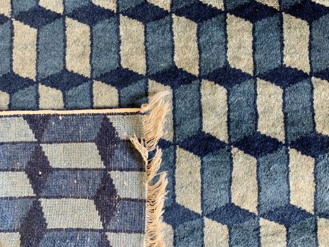 RUGS (2) - blue and cream ground with block pattern, 134 x 69cms and pink with three central roundels, 125 x 56cms