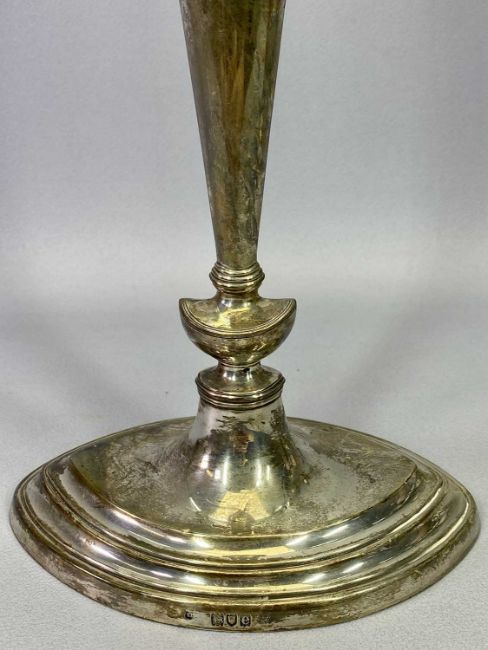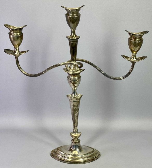 LONDON SILVER 3 LIGHT CANDLEABRA, A PAIR - dated 1900, Maker Thomas Bradbury & Sons, in classical Adams style, removable sconces and upper twin branch section, on waisted form stems and stepped oval bases (loaded), all pieces fully hallmarked, 49cm heights, 44cms across