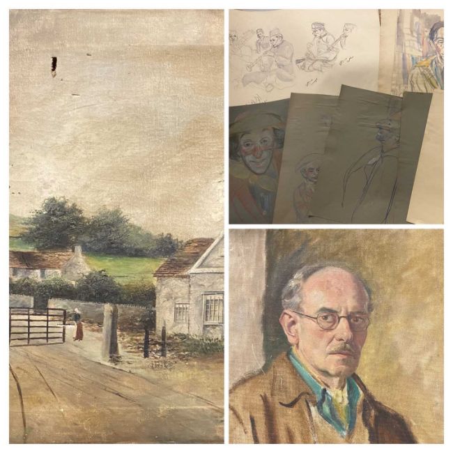 WILLIAM HIGHFIELD circa 1900, oil on canvas - Heeley Toll Bar, Sheffield, signed, 46 x 61cms, a 20th Century print - abstract rural scene, an unframed portrait painting on board of a gentleman, 51 x 46cms, and a portfolio of unframed watercolours depicting images of clowns