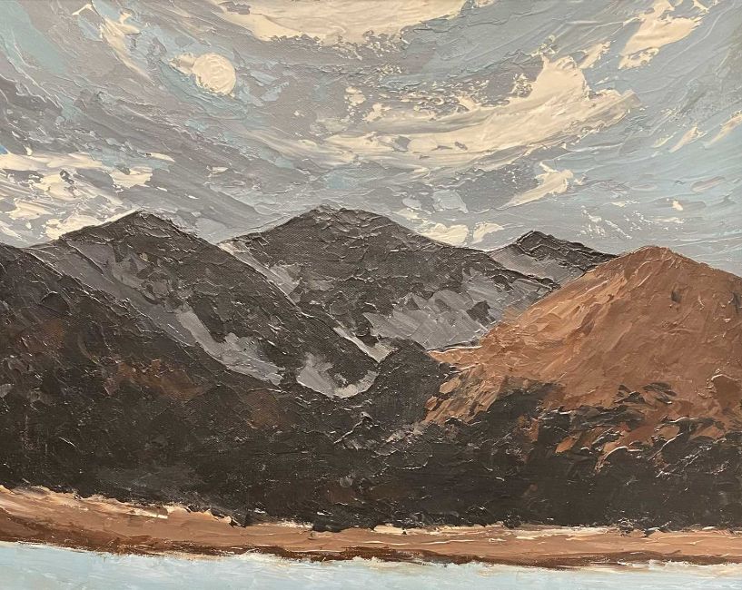 20TH CENTURY oil on board (pallet knife applied) - 'Moody' mountain scene, unsigned, 40 x 50cms