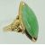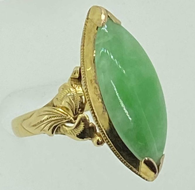 18CT GOLD JADE RING - the ellipse shape stone measuring 21mm x 10mm, slightly cabochon and top mounted with an almost fully closed back, the shoulders having knotted leaf detail, the shank stamped '18k', Size N, 4.5grms