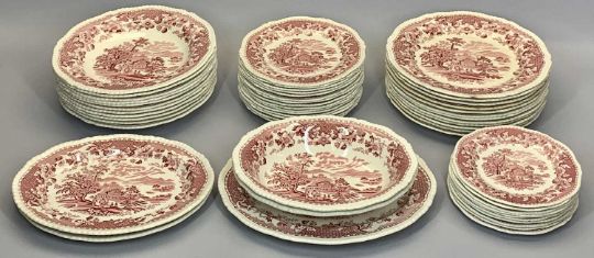 MIXED CHINA to include a set of three Jackfield ware graduated jugs from 17cms, a Woods Seaforth pink and cream dinner service of approximately fifty four pieces, a David Frith Studio Pottery table lamp, 32cms H excluding fitting and other Studio Pottery ETC