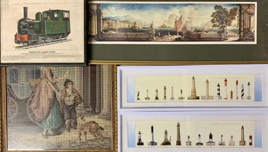 URUSHIBARA woodcut print - Still Life, signed in pencil, 29 x 37cms, an INDISTINCTLY SIGNED watercolour - a rocky coastline, 23 x 33cms, and an assortment of other paintings and prints including commemorative Welsh steam engine print, framed woolwork, Lighthouse print displays, ETC