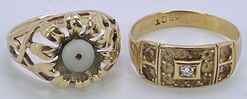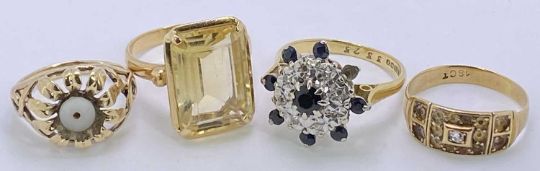 18CT GOLD DRESS RINGS (3) and one 9ct gold dress ring, the first stamped '750' with large smoky quartz type stone, Size Mid M-N, a smaller ring stamped '18ct', having one small central sapphire and all other surrounding stones missing, Size L, Birmingham hallmarked 18ct example having dark sapphires around an illusion floral setting, Size N, 11.6grms gross, the 9ct example fashioned as an openwork flower, lacking central stone, Birmingham stamp '9-375' Size Mid G-H, 2.2grms
