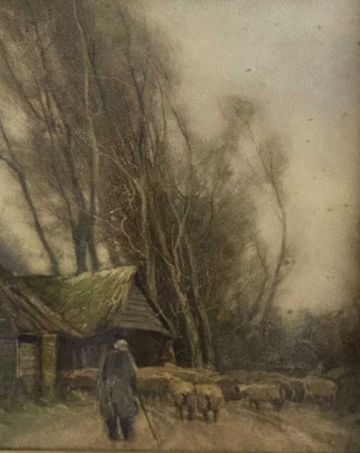 WILLIAM TATTON WINTER 1855-1928 watercolour - lady and dog in windswept landscape, signed lower right, 32.5 x 42.5cms and a similar watercolour - shepherd and flock by farm buildings, unsigned, 41.5 x 32.5cms
