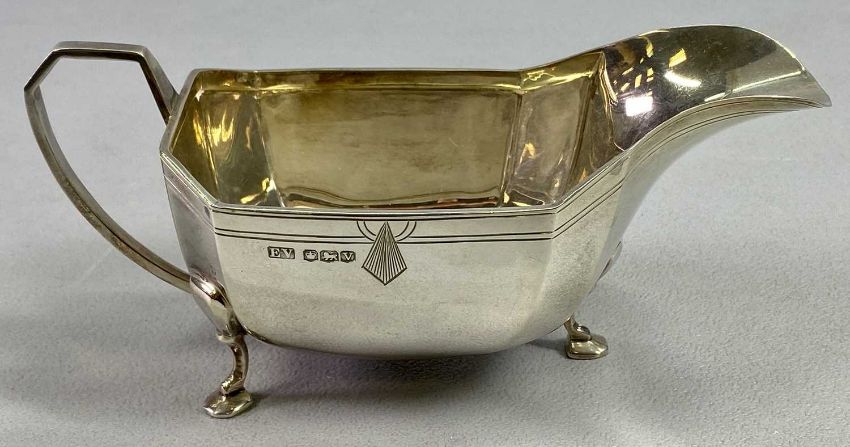 SHEFFIELD ART DECO SILVER GRAVY BOAT - 1938, Maker Emile Viner, 17.5cms L, having double line upper detail with Art Deco flash standing on three pad feet, 6.3ozt