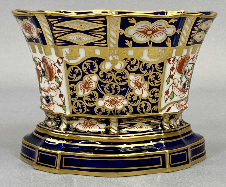 ROYAL CROWN DERBY TAZZA - shaped oval form and on pierced oval foot, 8704 pattern, 12.5cms H, 27cms W, 20cms D and a similar oval bowl, 1546/6199 pattern, 10cms H, 13cms W, 9.5cms D