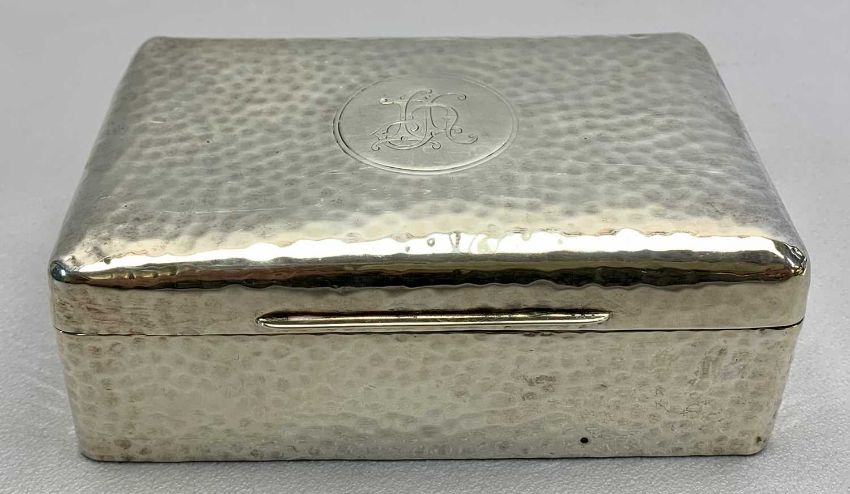 SILVER CIGARETTE BOX - rectangular form with hammered decoration, London 1924, Maker William Comyns & Sons, 5.5cms H, 14cms W, 9cms D, 11.1ozt including the liner