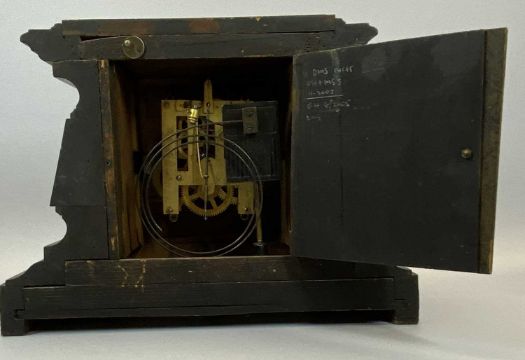 A JUNGHANS MANTEL CLOCK - in wooden simulated marble case, eight day movement striking on a gong, 27cms H, 36cms W