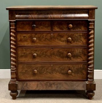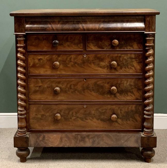VICTORIAN MAHOGANY CHEST with secret top drawer over two short and three long drawers having turned wooden knobs flanked by twist pillars, on substantial bun feet, 132cms H, 124cms W, 59cms D