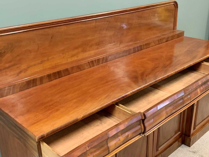 GOOD VICTORIAN MAHOGANY SIDEBOARD with deep back rail, inverted breakfront base with three frieze drawers and four arched panel cupboard doors, 140cms H, 227cms W, 68cms D
