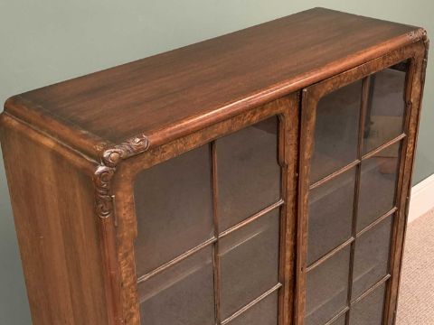 QUEEN ANN STYLE BURR WALNUT BOOKCASE CUPBOARD with twin glazed doors, on cabriole supports, 119cms H, 91cms W, 31cms D