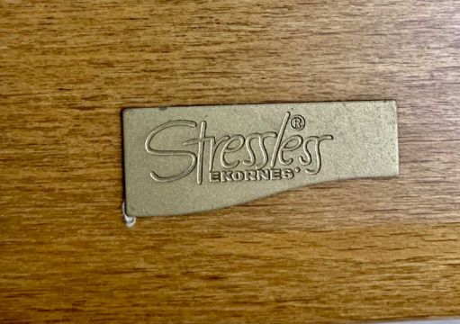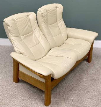 EKORNES, NORWAY RECLINER TWO SEATER SETTEE & ARMCHAIR - both in cream leather and oak, both bearing "Stressless" badge, 105cms H, 148cms W, 48cms D the settee and 104cms H, 94cms W, 48cms D the chair