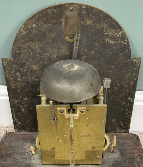 LONGCASE CLOCK - slim cased circa 1840 mahogany, arched brass dial set with Roman numerals, subsidiary seconds and strike /silent dials and date aperture by John Walker, Newcastle, eight day movement, twin weights and pendulum, 242cms H, 53cms W, 28cms D