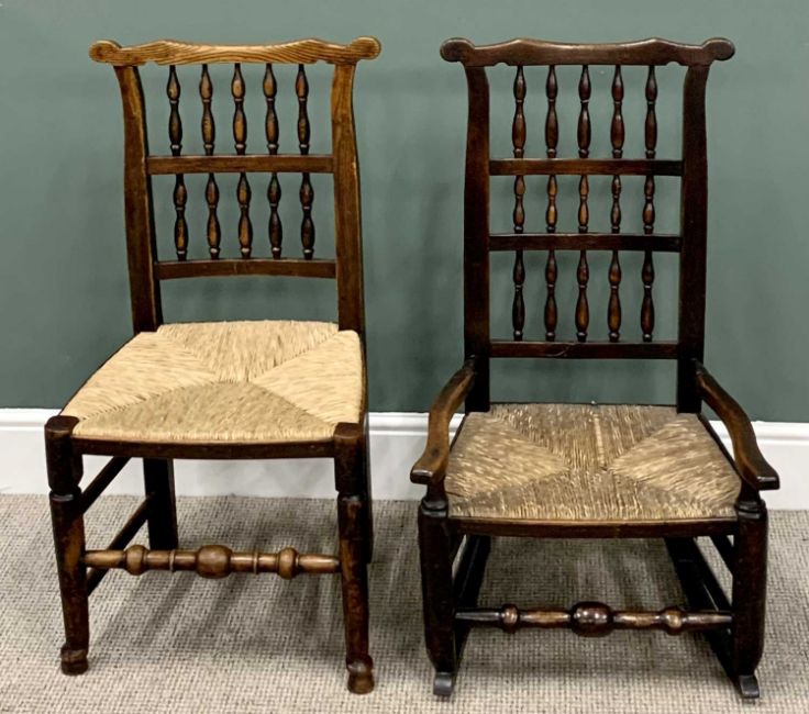 VINTAGE CHAIR ASSORTMENT (8) - elm and rush seated spindleback examples, 112cms H, 60cms W, 45cms D (the largest)