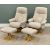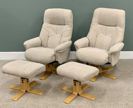 ULTRA MODERN PAIR OF COMFORT ARMCHAIRS WITH MATCHING FOOTSTOOLS - upholstered in oatmeal fabric, both having swivel and recliner action, 105cms H, 74cms W, 52cms D